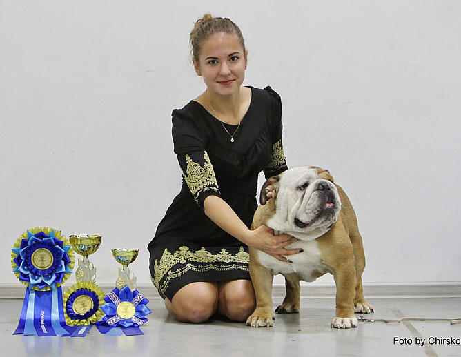 "СОЛ"Lemon Vom SoloЛемон Вом Солокобель , д. р. 26.05.2010 ЕДИНСТВЕННЫЙ бульдог, выигравший ШЕСТЬ РАЗ ПОДРЯД самую крупную выставку в стране- "ЕВРАЗИЮ"!!!ИНТЕРЧЕМПИОН16 x CACIB , 6 x RCACIB , 12 x Чемпион РКФ , 5 х номинация на КрафтЧемпион России , Беларуси , Украины , Латвии , Грандчемпион РоссииЛучший бульдог России 2012 и 2013 года(Чемпион Породы 2012 и 2013 года, Лучший Представитель породы 2012 и 2013 года)Пятикратный Чемпион Национального Клуба БульдогШестикратный победитель"Евразии"Двукратный Ветеран - победитель"Евразии"Призер ЧЕМПИОНАТА МИРА 2012 года в Австрии12-кратный Чемпион РКФюный Чемпион НКП , юный Чемпион РоссииПрошел тестирование на пателлу с идеальным результатом : PL 0 / 0 .